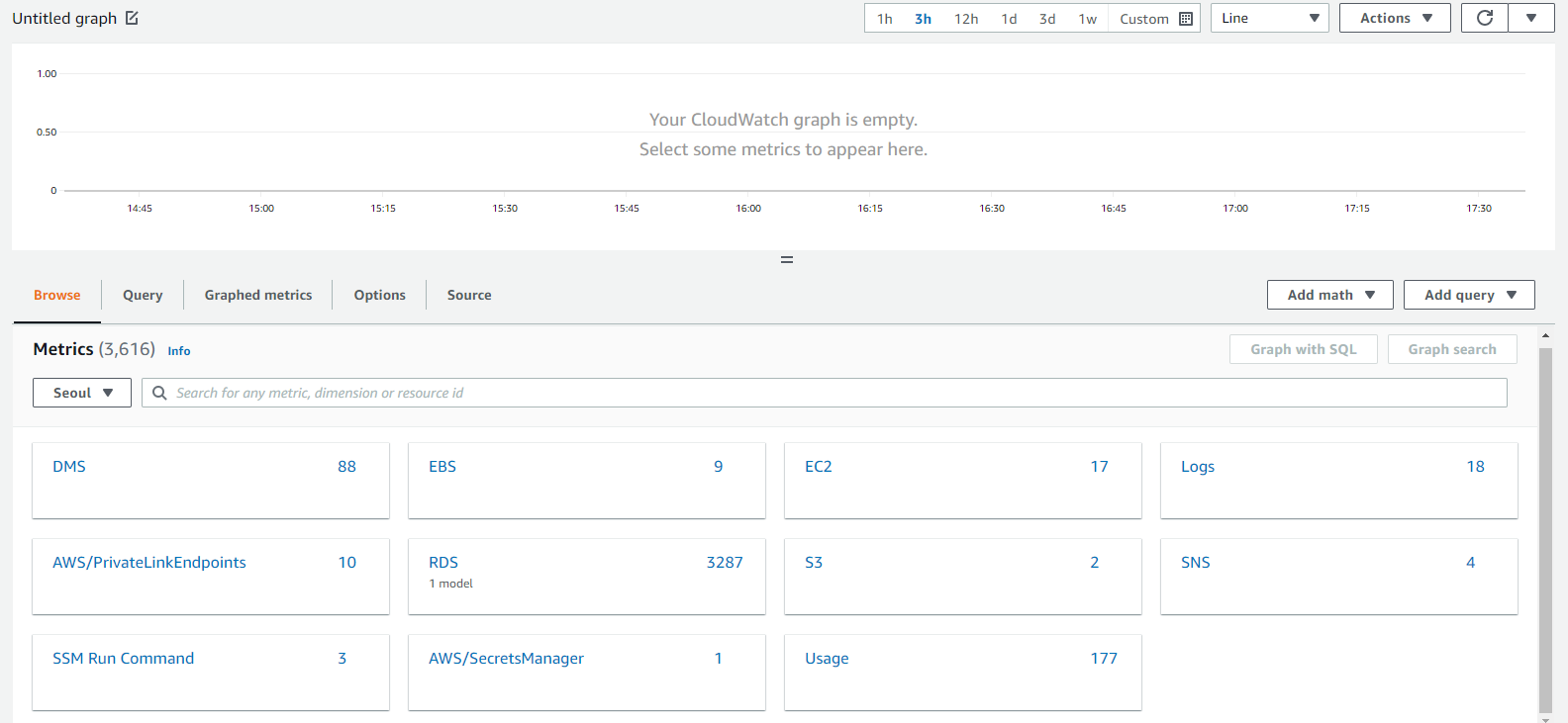 CW 에서는 AWS 에서 제공하는 다양한 서비스들에 대한 metric 을 볼수 있으며 이는 아래 화면과 같이 원하는 서비스나 metirc 명을 검색하면 확인 해 볼 수 있다.