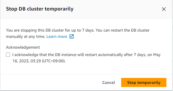 꺼둬야 할 필요가 생길 때가 있다. 이에 따라 AWS 다수 서비스는 사용자들이 불필요한 비용을 지불 하지 않도록 일지 중지 기능을 제공한다 (Stop temporarily). RDS, Aurora Cluster 또한 일지 중지기능을 제공한다. 아무래도 AWS 서비스들 대비 RDS 카테고리의 서비스들의 비용이 상당히 높기 때문에 불필요하면 일시 중지를 해두면 비용을 크게 아낄 수 있다.