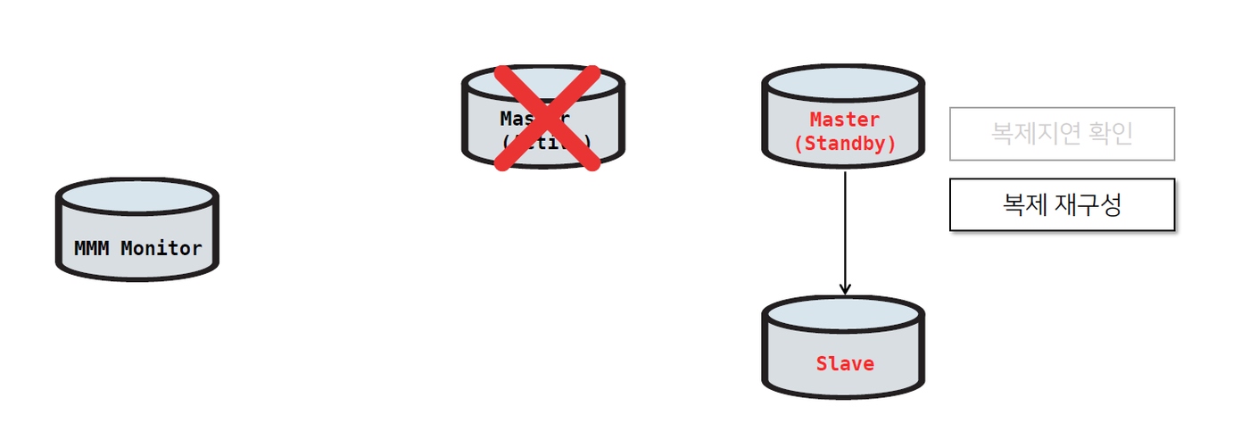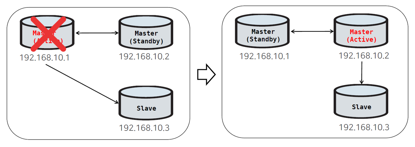 - Failover 가 끝난 후 후속 처리까지 마치면 아래의 구조로 변경 된다. (Slave 서버가 Master 로 승격된 서버와 동기화)