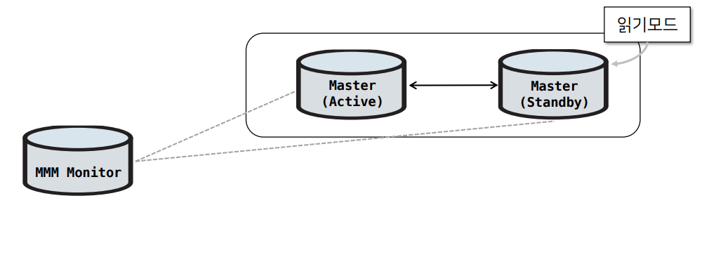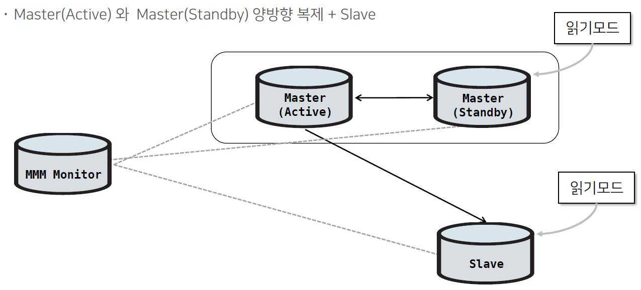- MMM 의 기본 구성은 아래와 같이 기존 Master-Slave 와 같이 읽기, 쓰기 역할이 명확한 기존 구조에서 HA Failover 를 위하여 Master 를 추가 하는 것을 목표로 삼는다.