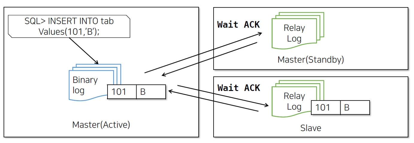 - 쓰기가 가능한 Master 서버의 변경 내용 (값: 101) 을 복제 대상 서버에 보내고 응답을 기다림