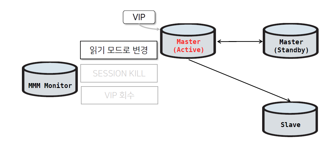 - Fail Over 구조는 아래와 같다. 먼저 각 DB서버간의 상태를 파악 하는 Monitor 가 구성시 설정되었던 VIP 를 이용한다. Active 서버 장애 발생 시, Active 서버의 데이터 변동을 막기 위해서 읽기모드로 변경 후,
