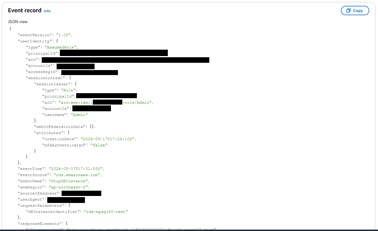 - 이 Event 를 클릭하여 확인하면 어떤 유저가 instance 를 수동으로 내렸는지 확인 할 수 있다. 이와 같이 불시에 발생한 Event 를 누군가가 수동으로 수행했었다면, 이를 추적하여 확인 할 수 있다.