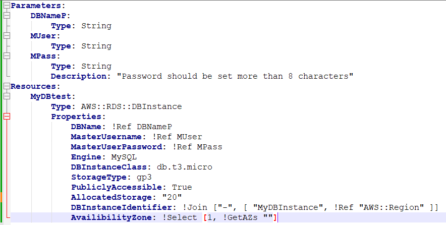 [1] 에서 언급했던 것 처럼, 먼저 Cloudformation 에서 RDS Instance 를 생성하려면 사용자가 YAML 파일을 생성해야 한다.