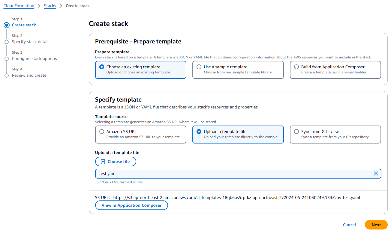 - Create stack 을 통해 다음 메뉴로 들어오면 template 을 생성 할지 또는 기존 template 을 가져올 지 선택 할 수 있다.