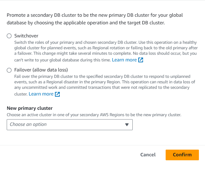 만일 재난이 예측이 되어서 미리 다른 Region 으로 서비스 구성을 옮기거나 훈련 또는 기타 이벤트 대응으로 다른 Region 을 Primary 로 이용하고자 한다면 switchover 를 이용하는게 적절하다.