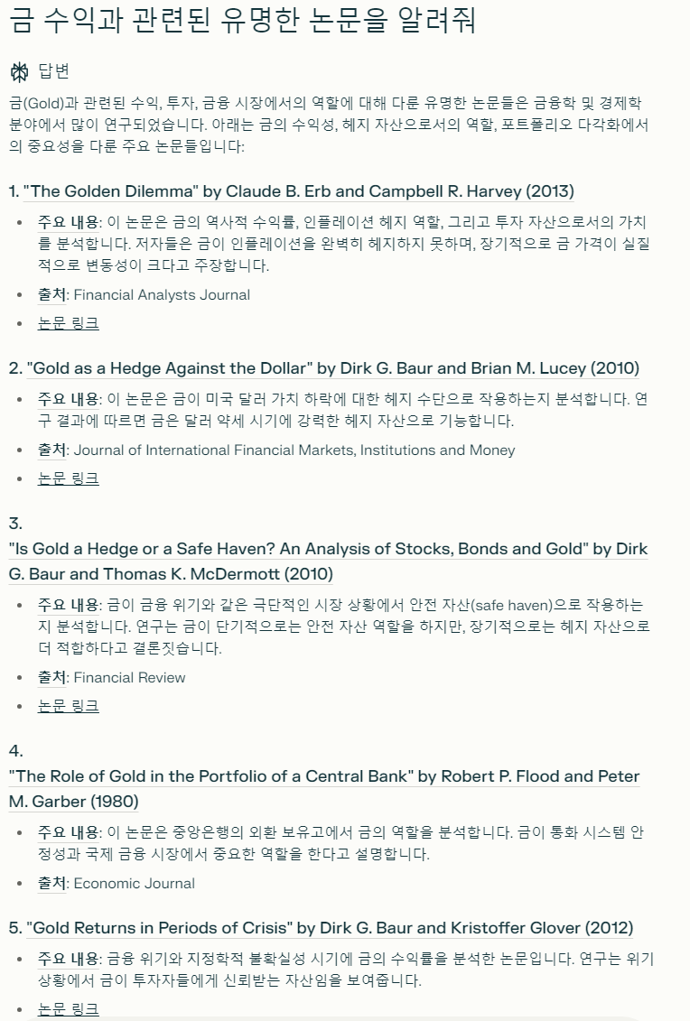 예를 들어, 자신이 투자와 관련한 논문을 검색하면서 공부를 하고 싶을 때, Perplexity 는 아래와 같이 논문링크까지 정리해서 답변을 해 준다.