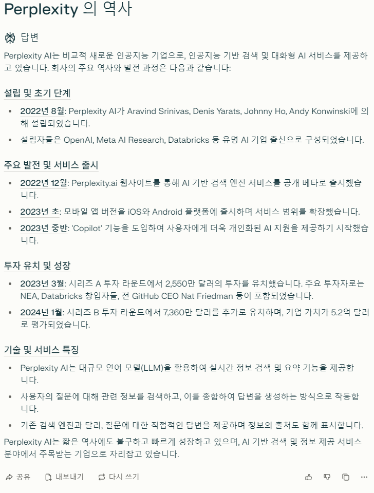 여기서 Perplexity 는 '기술 및 서비스 특징' 과 같이 LLM 을 통하여 실시간 정보 검색 및 요약기능을 강점으로 삼는 solution 이고