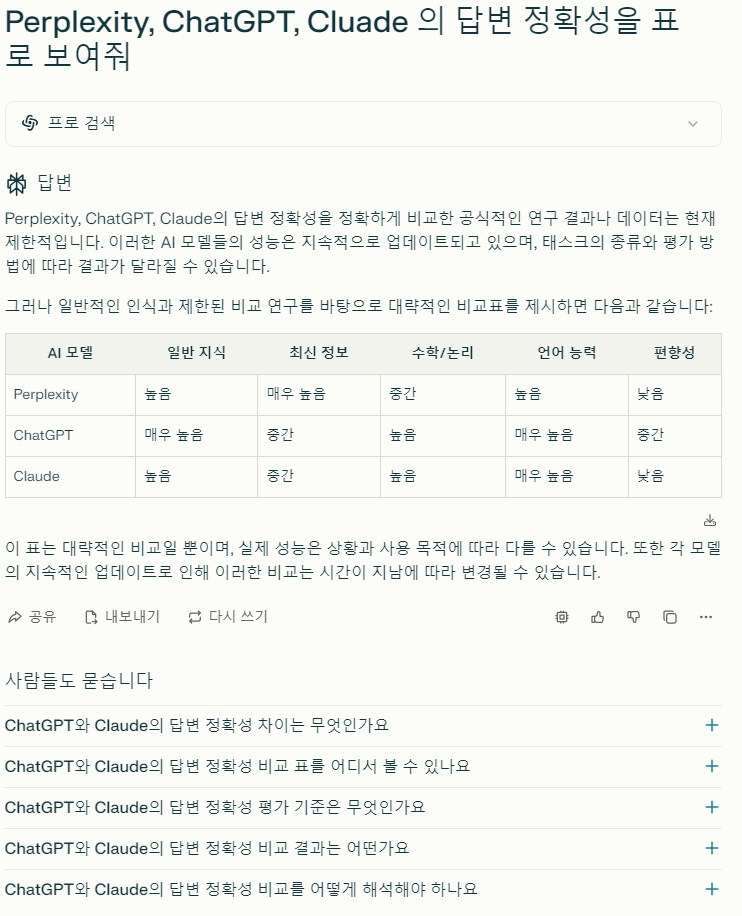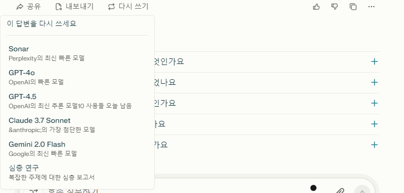 또한 Perplexity Pro 에서는 이용 AI engine 도 바꿀수 있기에 Pro 를 사용한다면 다양한 engine 을 통해서 답변을 얻어보는 것도 좋은 방법이다. 위의 예시는 Perplexity Pro 의 자체 AI engine 을 썼다면 아래와 같이 ChatGPT engine 으로 답변을 얻으면 색다른 답변을 얻을 수 있다.