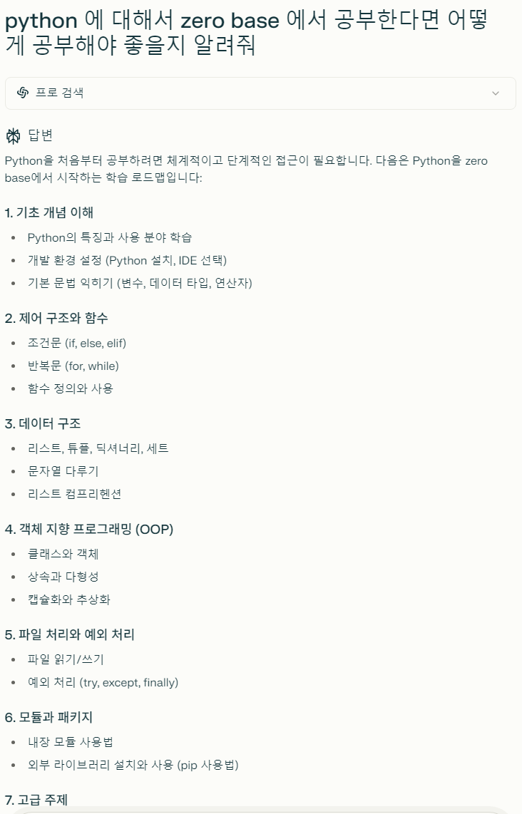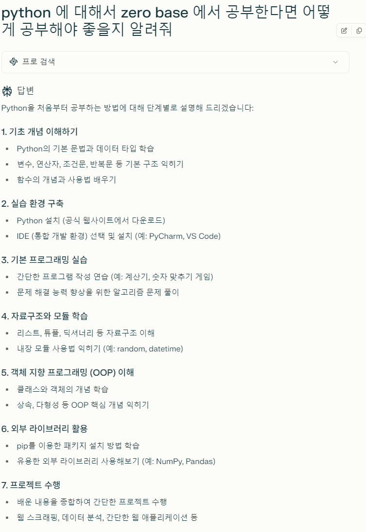 AI 가 활용되기 전에는 사람들은 자신이 공부하고 싶어하는 영역에 대해서 어떻게 공부할지에 대해서 발품을 팔면서 다양한 서적, 관련 업종에 종사하는 분들을 만나면서 알아가야 했다면, Perplexity 는 위의 장점들과 연계되어 어떻게 이에 대해서 준비를 할지를 아래 예시와 같이 알려준다.