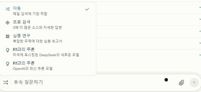 특히, Perplexity 는 Pro 를 사용하면 Perplexity 의 자체 pro AI engine 이외에 아래와 같이 ChatGPT, Claude, DeepSeek 추론등의 다양한 engine 들을 이용 해 볼 수 있다.