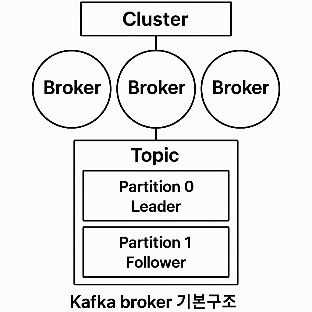Kafka 서버 한 대를 일컫는다. 메시지를 저장하고 관리하는 역할을 한다. 여러 대의 브로커가 모여 클러스터를 구성하며, 데이터를 분산 저장해 확장성과 내결함성을 제공한다.