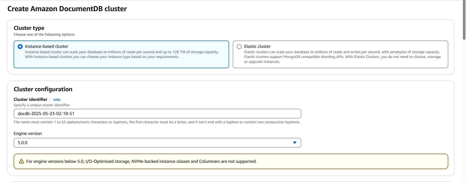 - 다시 화면 상단에서 보면 Cluster Type 을 고를 수 있다. 이는 각각 provisioned, MongoDB sharding 을 응용한 cluster 로 보면된다. 본인 테스트에서는 instance-based cluster 를 선택한다.