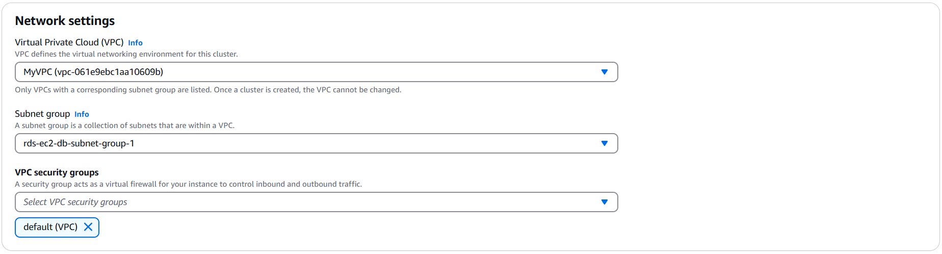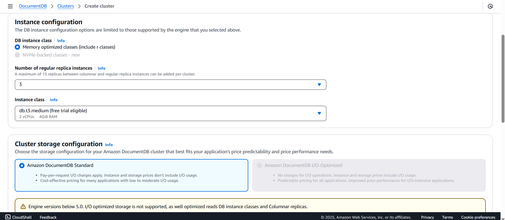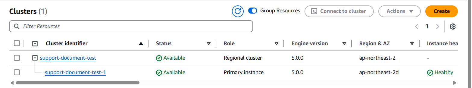 - DocumentDB 의 Cluster 생성 메뉴는 RDS & Aurora 서비스와 동일하므로 이는 간략하게 설명한다.