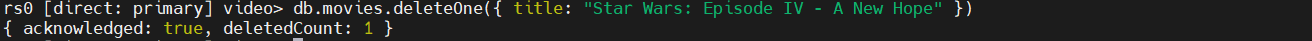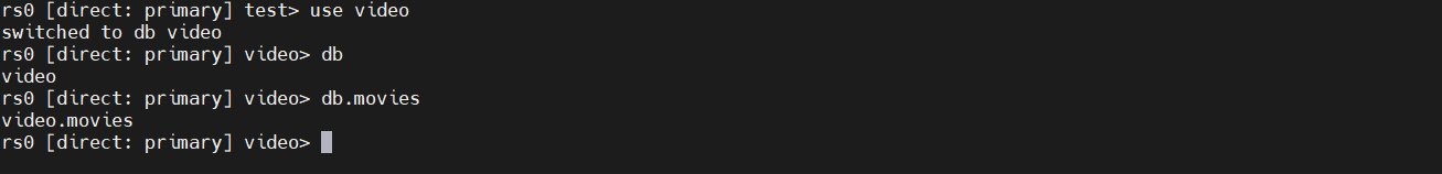 - 이제 여기서 사용자는 간단하게 DB 사용 및 CRUD 를 사용 해 볼 수 있다. 아래 예시는 video db 생성 및 video 라는 db 에 movies 라는 collection 을 만든다.
