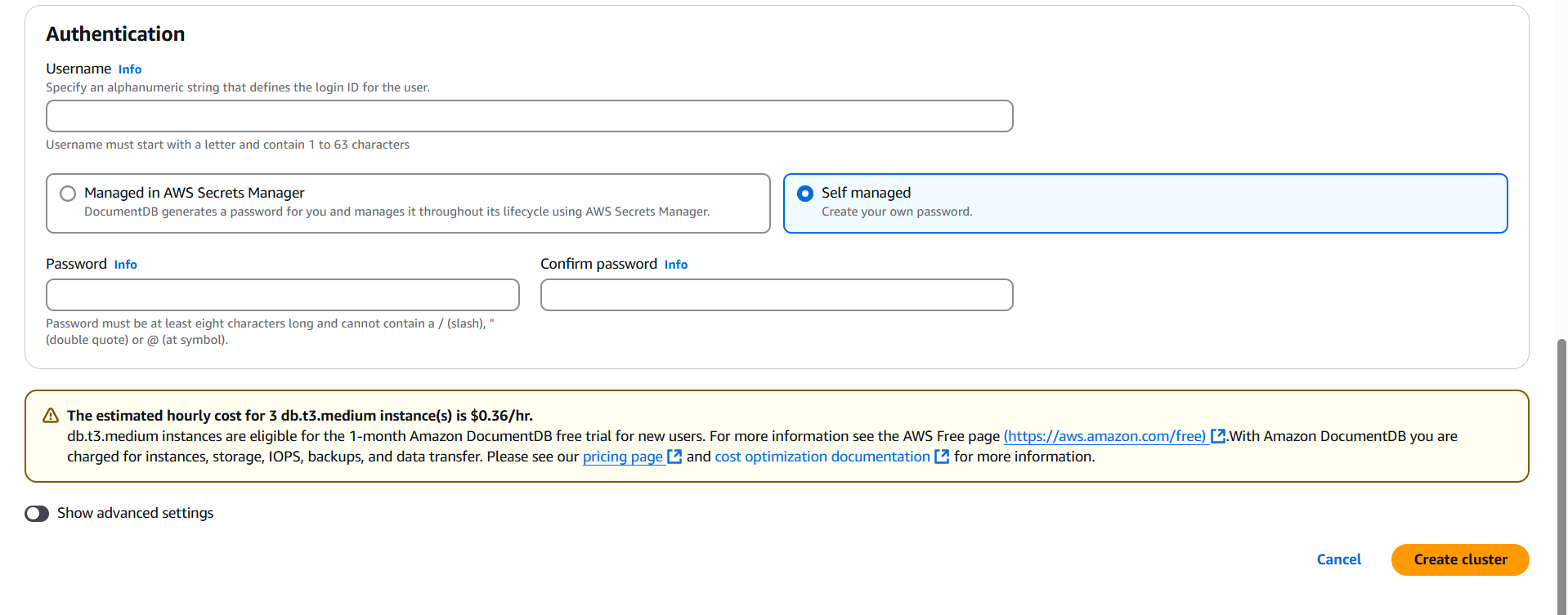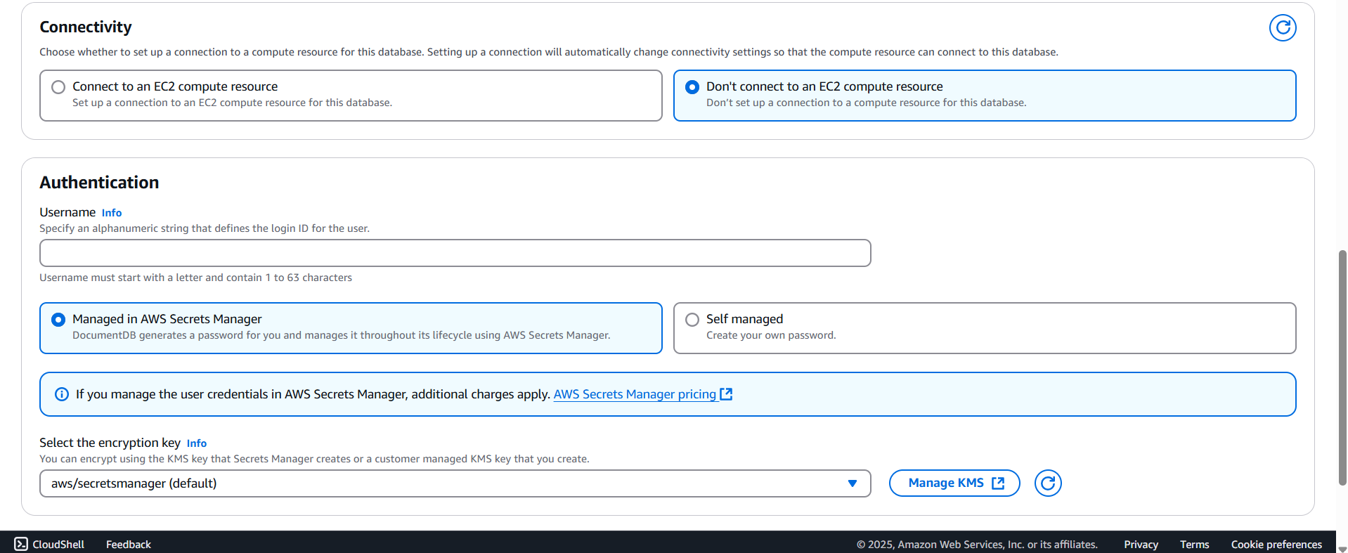 - 처음 DocumentDB 를 쓸 때 사용할 user 를 만들 수 있다. Secrets Manager 및 Self Managed 중 하나를 선택할 수 있으며