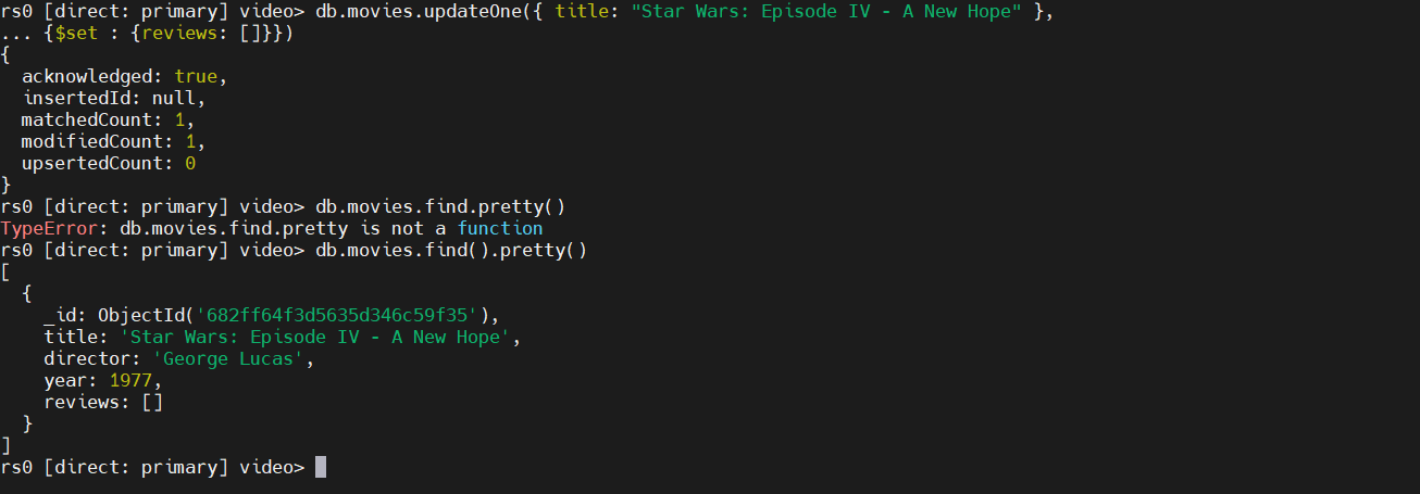 - Insert 를 해봤다면, update 도 해 볼 수 있다. 해당내용은 title 조건에 부합하는 document 에 review field 를 추가한다.