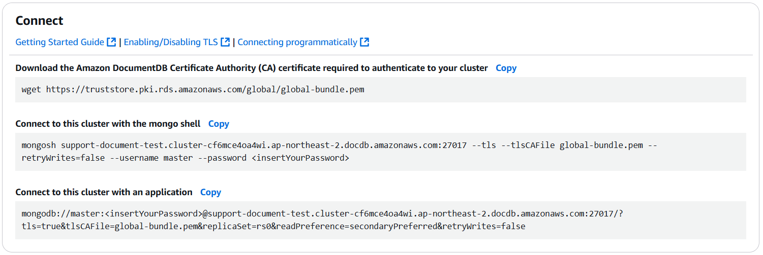 - 위의 내용을 참고 후 pem file 을 받는다. DocumentDB 는 접속시 CA 인증서를 통한 TLS 접속을 필수로 요구한다.