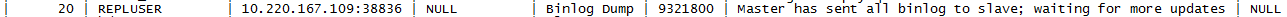B 서버의 Binary Log 파일은 A 서버와의 동기화가 끝난 후, 마지막 절차로 동기화 기입을 완료한다. - 실제 Replication 으로 구성된 Master 서버의 세션들을 확인해보면 위의 Dump Thread 는 Binlog Dump 로 항시 연결 중 임을 확인 할 수 있다.