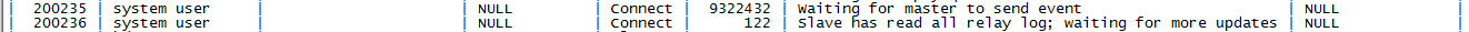 - Slave 서버내의 세션들을 확인 하면 각각 I/O thread (waiting for ~) 및 SQL thread (Slave has ~) 가 연결 중 임을 확인 할 수 있다.