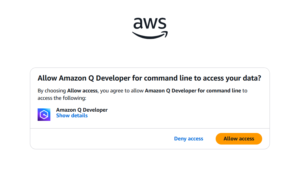 - 로그인이 정상적으로 되면 아래와 같이 Amazon Q 가 자신의 데이터가 접근하도록 허용한다.