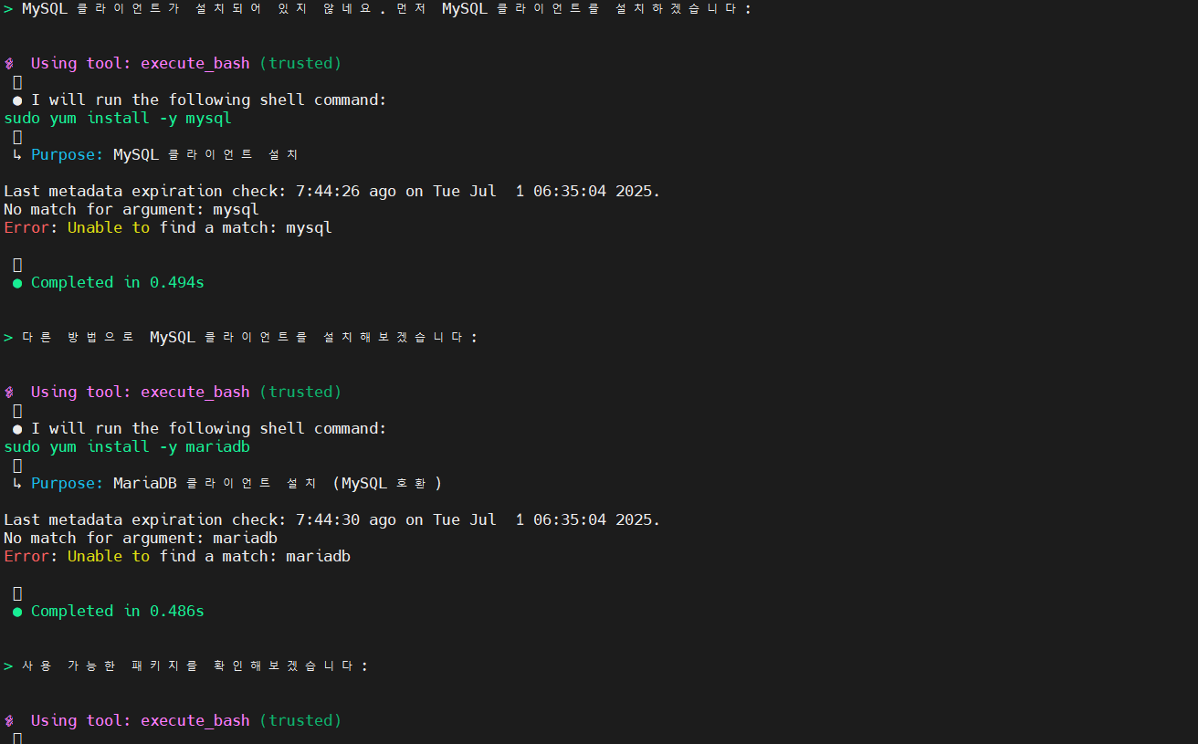 - 이후에 MCP 의 장점을 기술하겠지만, MCP 는 아래와 같이 사용자 환경에 맞춰 공개 AI 솔루션의 답변이외에 자체적인 조치도 취할 수있다. 예를 들어 필자가 사용하는 Amazon Linux 에는 MySQL Client 가 설치되어 있지 않아 실제 DB 작업을 할 수 없었지만, Amazon Q 에게 특정 작업을 요청하면서 Amazon Q 가 이를 확인 필요한 조치도 알아서 취할 수 있다.