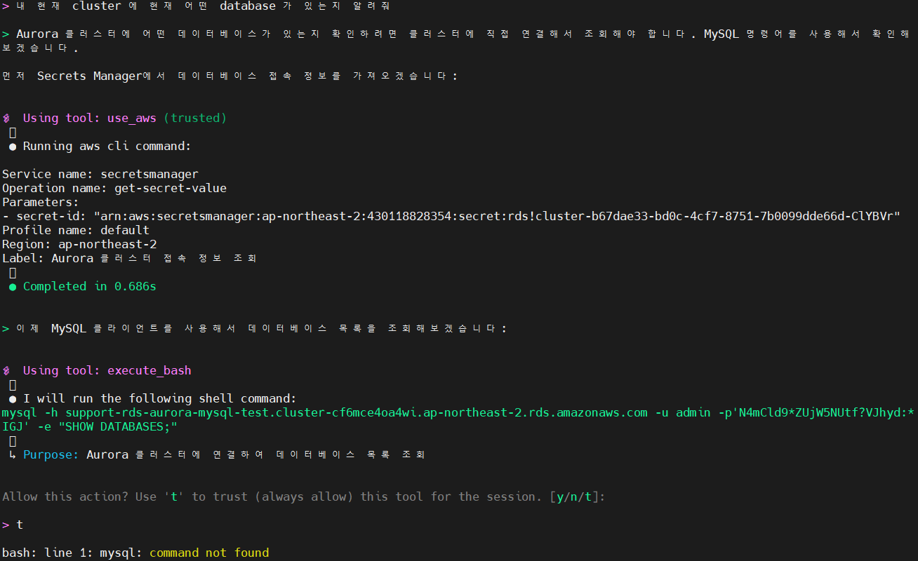 - 위와 같이 Amazon Q 가 접속이 가능해 지면 DB 작업 등도 요청 할 수 있다. 이 때, 아래에 보면 Amazon Q 가 DB 작업을 수행하도록 허용 하도록 한번 더 묻는데. 여기서 필자는 Amazon Q 가 계속 이후에도 작업을 하도록 t (trust) 로 설정했다.