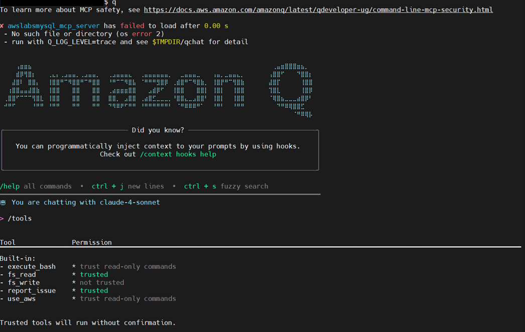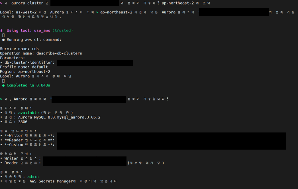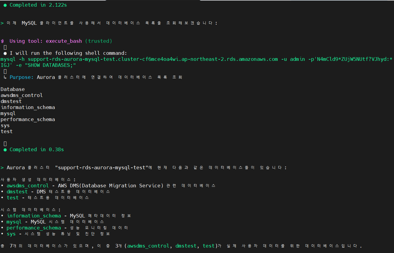 이와 같이 사용자가 SQL 및 명령어등을 직접 작성하지 않아도 Amazon Q CLI MCP 가 사용자의 환경에 맞춘 답변을 내놓 도록 할 수 있다.