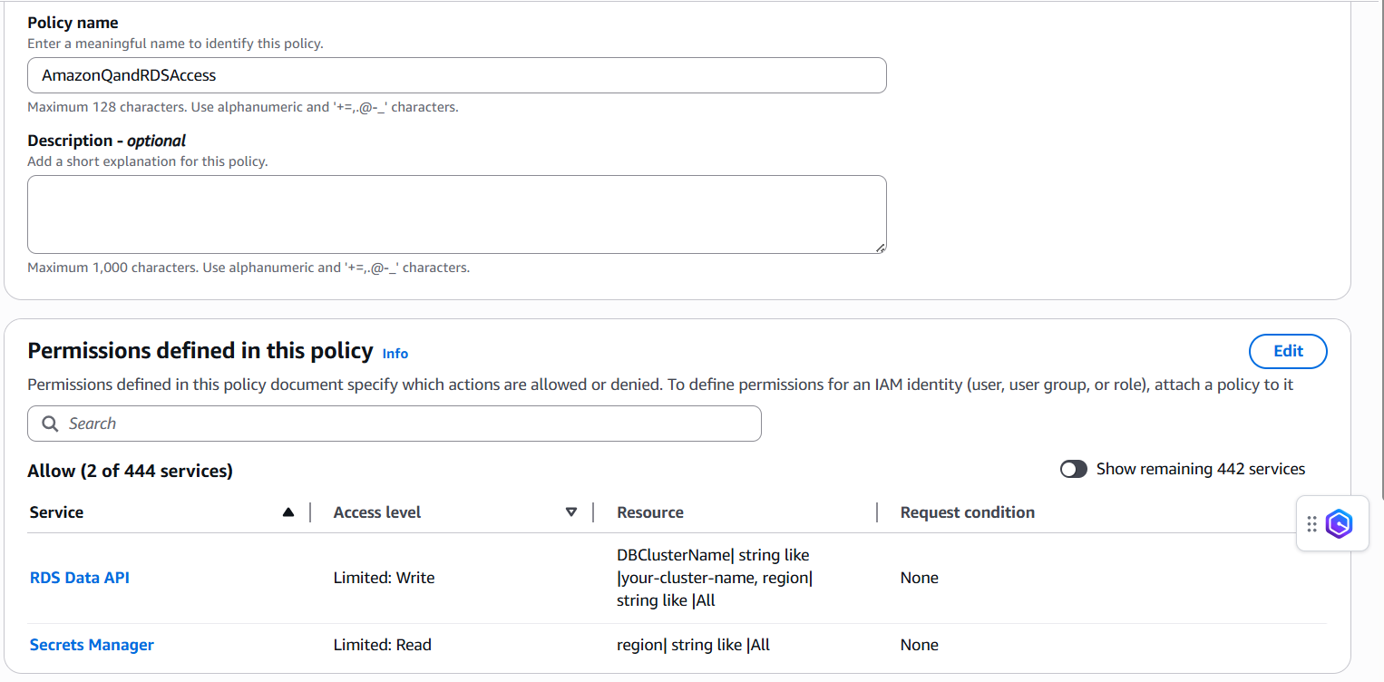 - 이제 Amazon Q CLI 가 RDS, Aurora Cluster 에 사용할 Data API 및 Secret Manager 를 사용하려면 아래와 같이 IAM 권한을 추가 해 줘야한다. 필자는 이를 신규 Policy 로 만들어서 사용중인 role 에 넣었다.