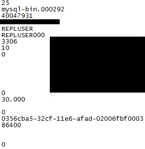 - master info file 을 열면 아래와 같이 동기화중인 binary log file 번호, job 번호, repl 동기화 시 사용하는 정보등을 확인 할 수 있다. (replication metadata)