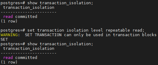 - MySQL / MariaDB 처럼 세션 단위로 조절 할 수 있으나 SET 으로 수행 시, 경고가 발생하면서 수행이 되지 않기에 BEGIN 을 사용 하여야 한다.