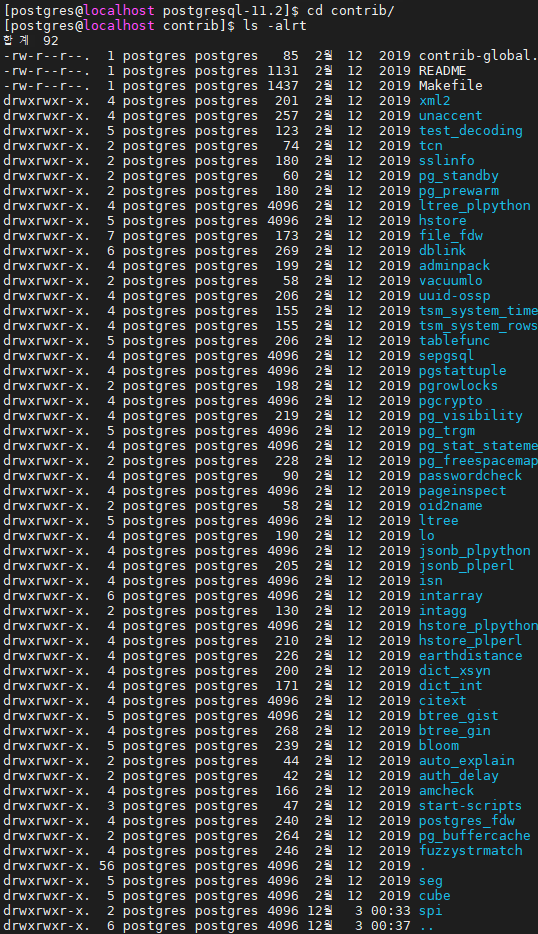 그렇기에 수동으로 extention 파일 인식 및 DB 내 구성을 위해서는 아래와 같은 방법을 사용한다. - 우선 source 파일 디렉토리에 들어가면 contrib 디렉토리가 있을 것이다. 들어가보면 아래와 같이 기본 extension 구성 파일들이 있는 각 extension 별 디렉토리가 있을 것이다.
