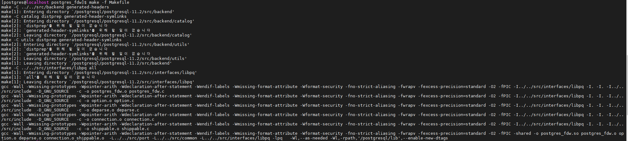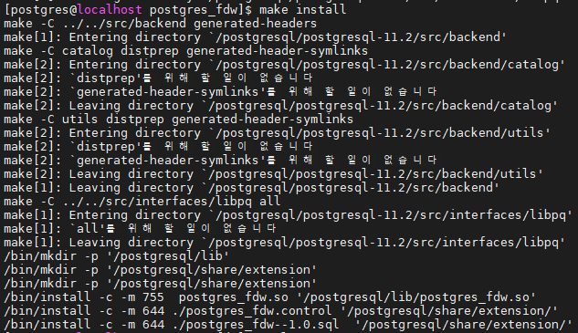 먼저 아래의 순서대로 명령어를 입력 해서 아래와 같이 make 로 extension 디렉토리 구성 및 설치 하는 것을 보도록 한다.