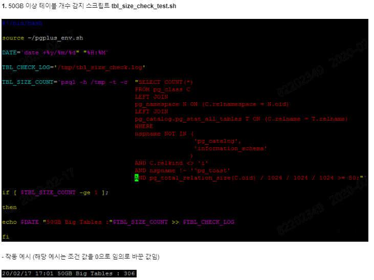 작성 사유: 운영 서버들 중에 용량이 큰 테이블들이 발생 시 차후 대량 조회 쿼리 등으로 이한 서비스 지연이 발생할 수 있으므로 이에 대한 조치를 마련 할 수 있도록 데이터가 쌓여서 대형 테이블이 된 테이블들을 관리 하기 위해 만든 관제 스크립트. (사내에서는 대형 테이블 기준 SIZE를 50GB로 세팅)