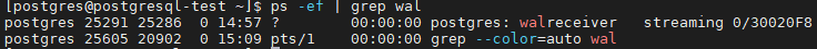 실제 구동되는 리플리케이션 내부에서 프로세스를 확인해보면 아래와 같이 Slave Server 에서는 Wal Receiver 가 추가로 기동되어 있다.