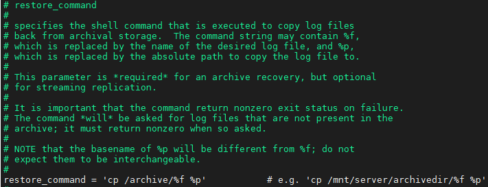 - 설정이 끝나면 Slave 서버의 recovery.conf 파일에서 restore_command 를 추가하면 된다.