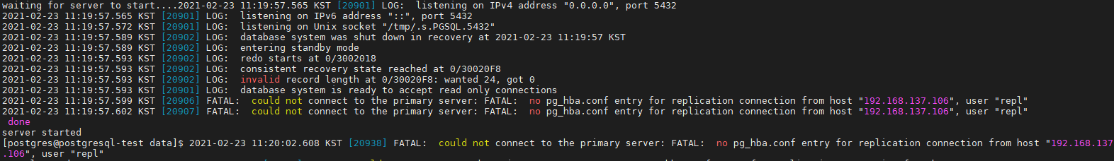 - 해당 파일들로 전부 전달하면 Slave 서버에 있는 DB가 WAL 의 변경 내용들을 읽어들여서 Master Server 와 동기화 상태가 된다.