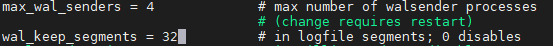 - wal_keep_segments : wal file 을 보관하는 디렉토리에 최대 보관 할 wal file 갯수를 지정한다. wal file 이 지속적으로 적대 되면서 최대 갯수를 초과하게 될 시, 맨 처음부터 overwrite 되어