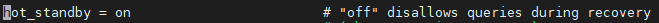 - 그 후, slave 서버의 postgresql.conf 에서 Master 서버와 같이 listen_address 를 * 로 설정 하고, 아래의 hot_standby 파라미터를 on 으로 조절한다.