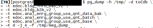 -n, --schema=SCHEMA 지정한 SCHEMA들 자료만 덤프 : 단일 스키마내에 오브젝트만 dump 시에 유용하다. (dump 시 조금이라도 다른 스키마랑 혼용 된다면 스키마를 분리한 dump 수행을 구성 해 볼 수 있다.)