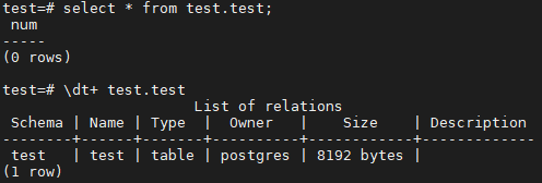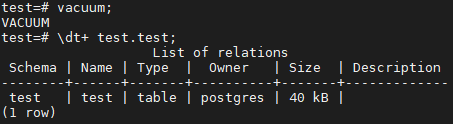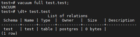 Vacuum Full 을 수행하면 아래와 같이 물리 block 까지 완전 반환하여 0 bytes 가 되는 것을 확인 해 볼 수 있다.
