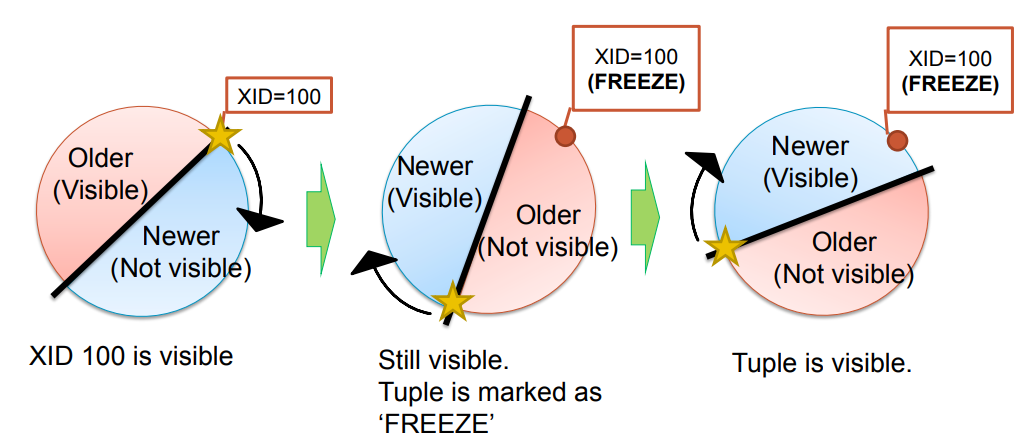 PostgreSQL 에서는 40억개의 txd 를 절반씩 나누어 기존자료를 가지는 old (older) 와 dml 로 변경될 데이터를 가지는 new (newer) 로 구분한다. old 버전은 기존 DB에서 보여지는 트랜잭션 영역, newer 버전은 아직 수행되는 이후 트랜잭션에 분배할 txd 영역이다.