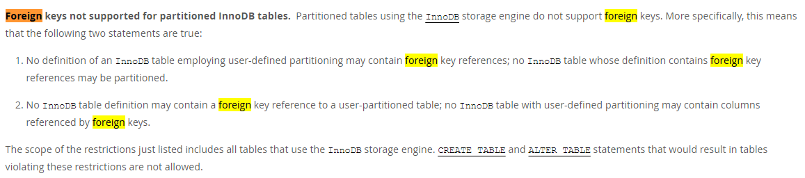 MySQL / MariaDB 는 외래키가 존재 시, 파티셔닝이 불가하다. 작업 전 AO 및 개발팀과 이에 대한 협의를 진행해야 할 필요가 있음