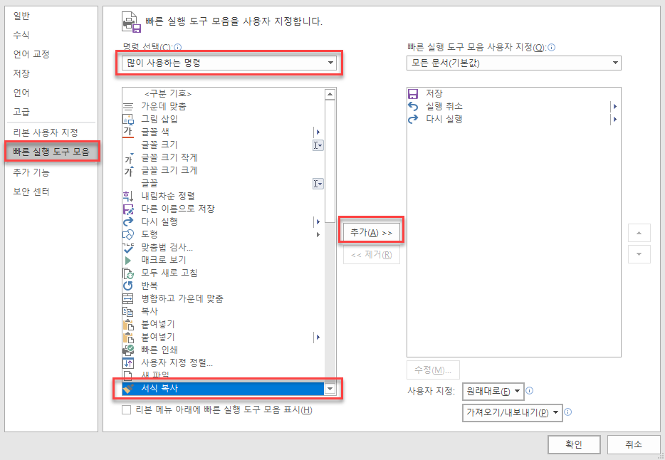 기타 명령을 누르면 왼쪽의 빠른 실행 도구 모음 -> 많이 사용하는 명령 -> 서식복사 -> 추가 순서대로 클릭하여 빠른 실행도구에 서식복사를 추가한다.