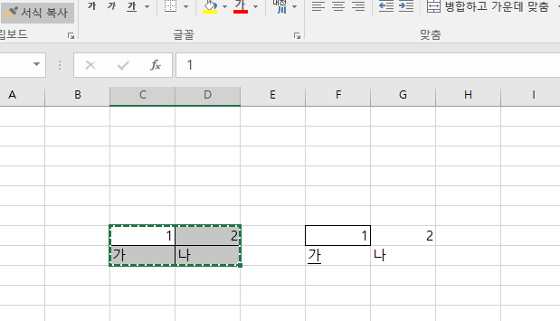 이 상태에서 오른쪽에 1이 적힌 셀만 누르면 해당 셀만 테두리가 복사 된 것을 볼 수 있다.