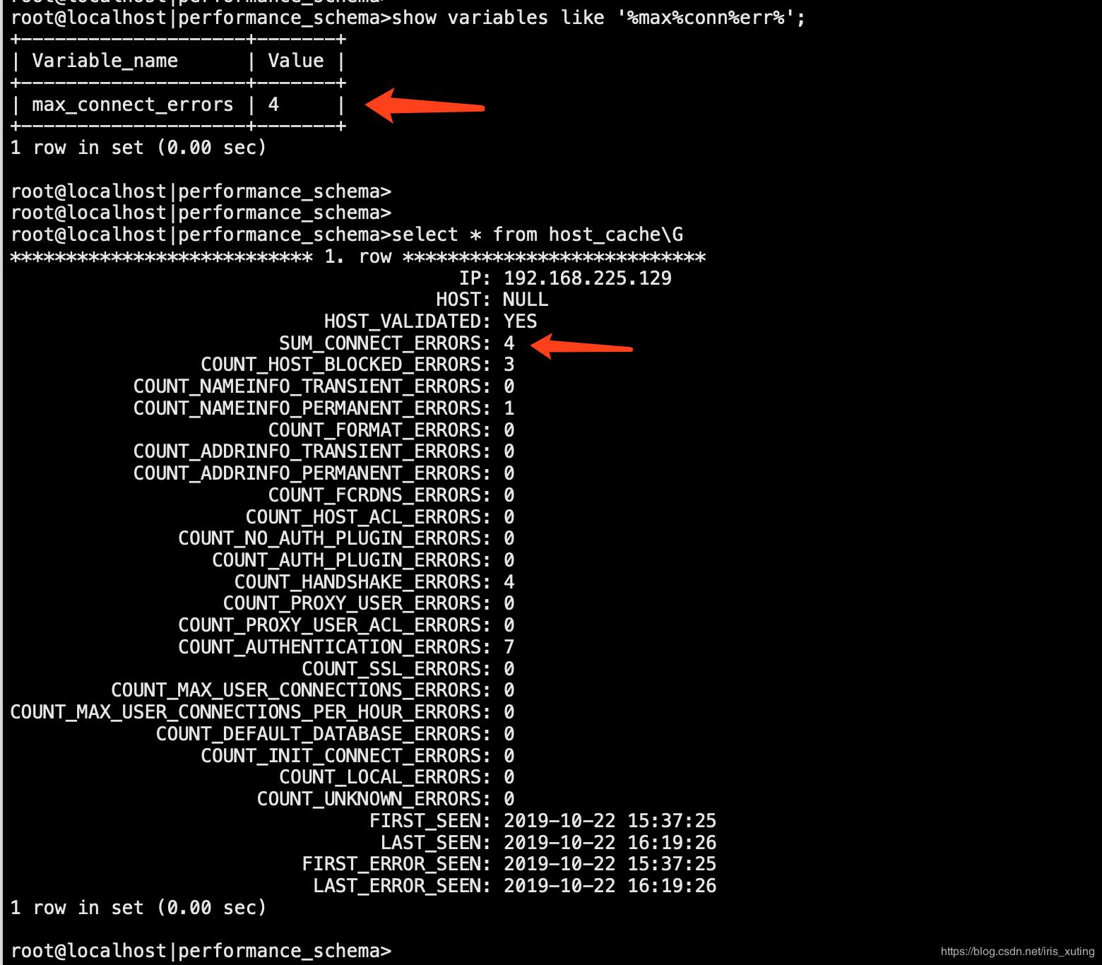 실제 어떤 호스트가 에러를 발생시키는지를 보려면 performance_schema.host_cache 의 SUM_CONNECT_ERRORS 컬럼을 보면 된다. (실졔 운영서버내 테이블은 사내 서버 IP 를 노출 시키므로 외부 예시 화면으로 대체)