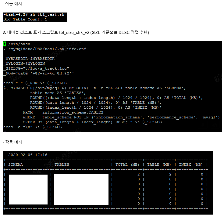 운영 서버들 중에 용량이 큰 테이블들이 발생 시 차후 대량 조회 쿼리 등으로 이한 서비스 지연이 발생할 수 있으므로 이에 대한 조치를 마련 할 수 있도록 데이터가 쌓여서 대형 테이블이 된 테이블들을 관리 하기 위해 만든 logging, 관제 스크립트들이다.