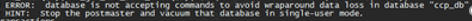 이 때는 이를 위한 상호간의 커뮤니케이션 및 협업이 원할하게 되지 않아 지속적으로 age 가 상승하는 상황이었고, 결국은 장애 발생날 아래의 error log 를 발생 시키며 DB가 트랜잭션을 받지않는 비정상 상태가 되었다.