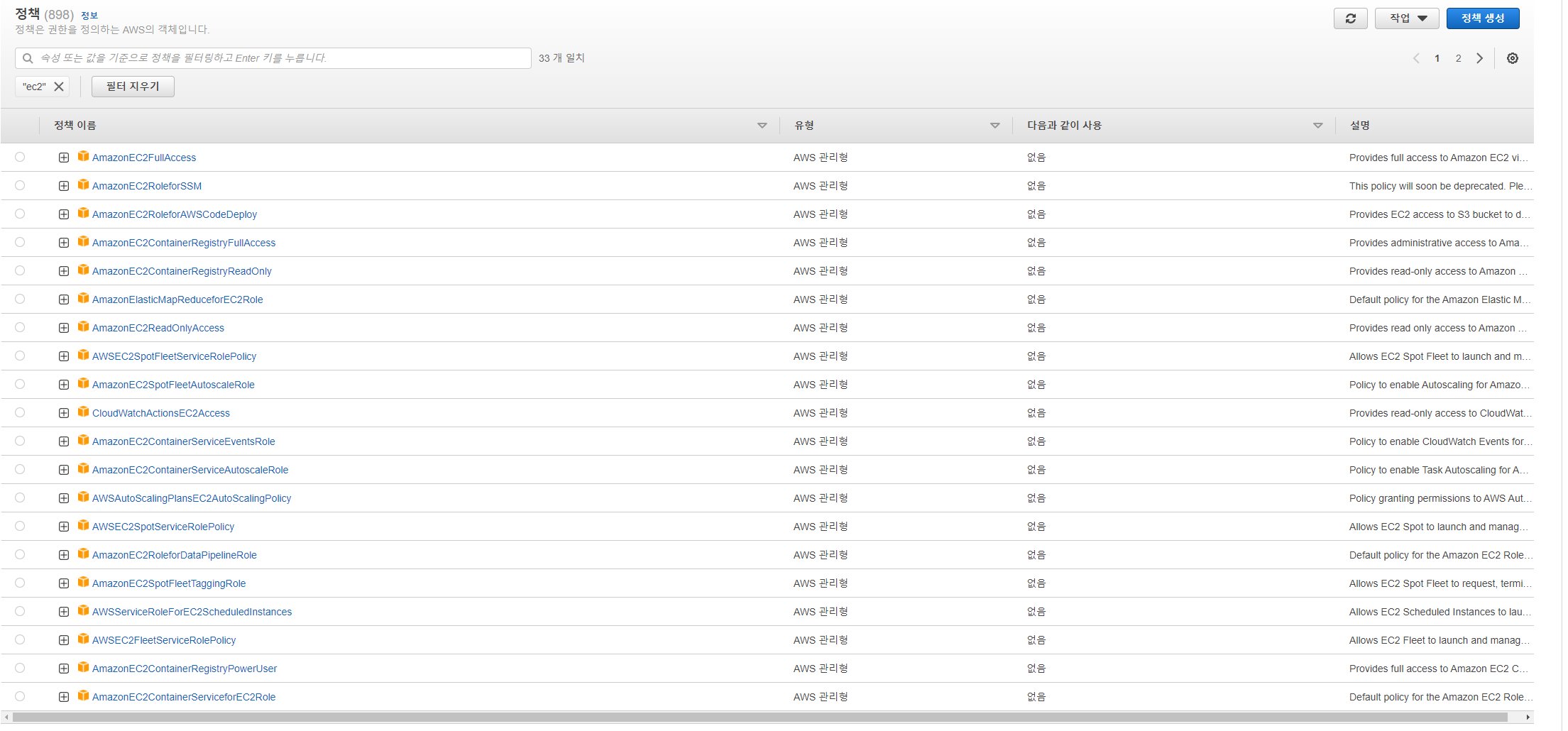 실질적으로 사용자 혹은 그룹에게 서비스 사용 허가, 제한을 조절하기 위해 사용하는 객체들이다. 예를 들어 아래 화면과 같이 EC2로 검색하면 EC2와 관련된 권한 정책들이 나오며 여기서 필요한 정책을 골라서 유저 혹은 역할에 부여를 할 수 있다. (역할에 부여를 하면 그 역할을 사용자에게 부여해야 그에 따른 사용자의 서비스 사용 권한이 부여된다.)
