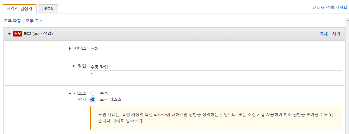 - 그러면 좌측에 거부로 설정이 바뀐다. 여기서 작업은 아래와 같이 수동작업의 모든 EC2 작업을 클릭한다.